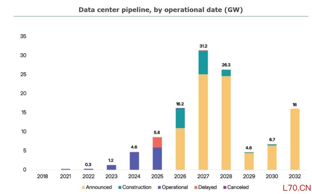 这一缺口在未来数年将进一步扩大。据报道,2027年已宣布的21.5吉瓦规划容量中,实际在建规模仅约6.3吉瓦。2028年至2032年间,绝大多数规划项目甚至尚未破土动工——37吉瓦的规划基础设施中,仅4.5吉瓦已实际开工,且大量项目尚无明确竣工时间表。