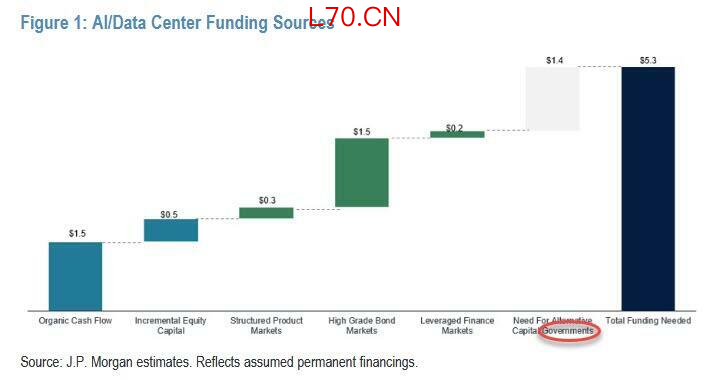 据摩根大通分析,完整支撑本轮AI周期所需资金规模不低于5万亿美元,即便考虑到科技巨头的大规模资本开支与债务融资,美国政府仍需填补逾1万亿美元的资金缺口。