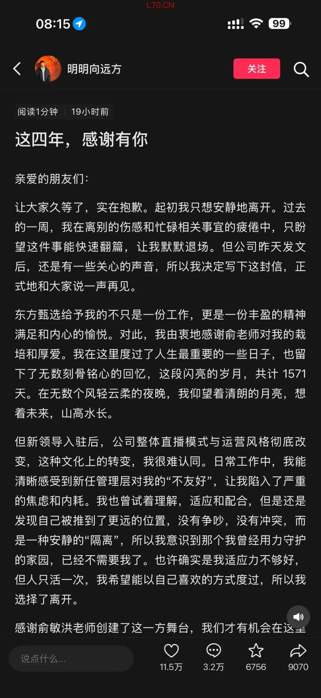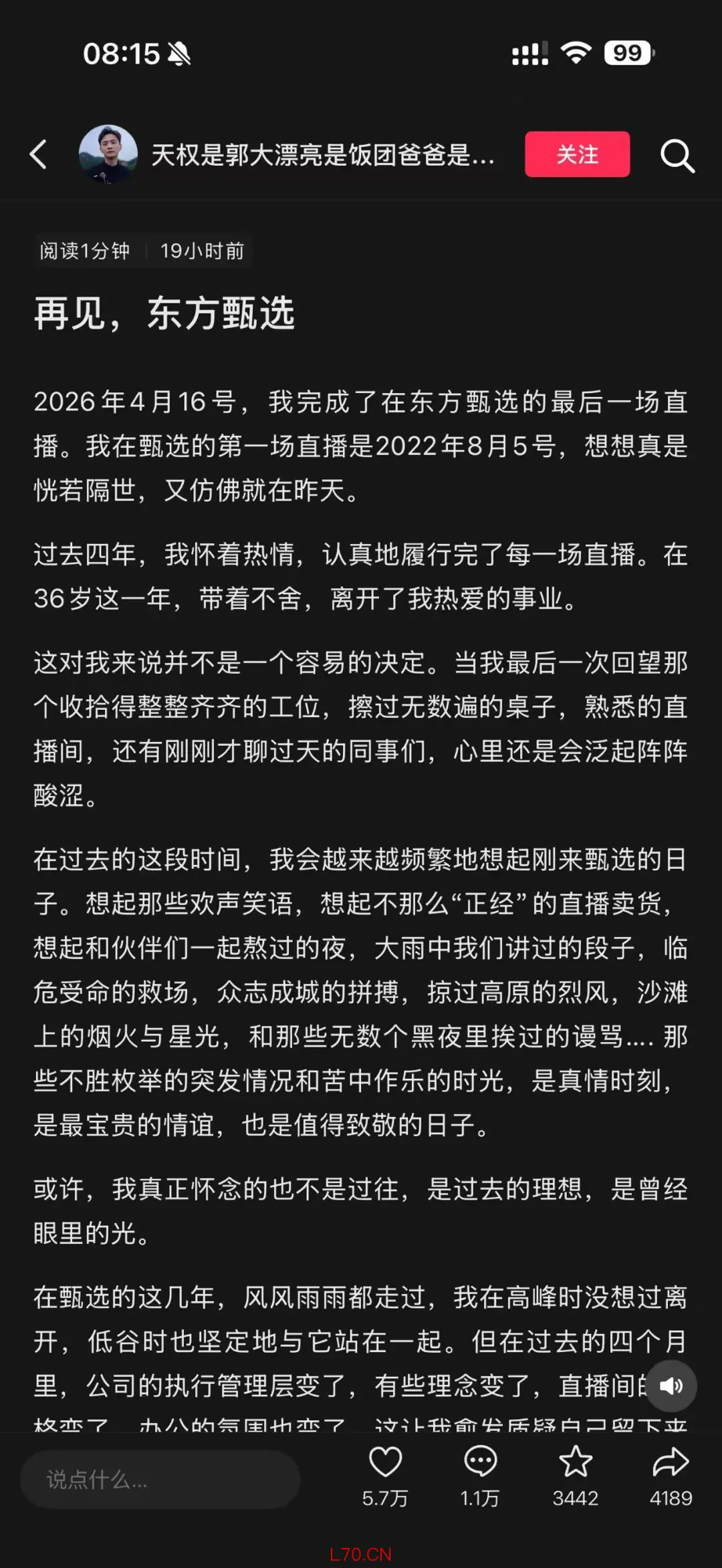 天权称:“在过去的四个月里,公司的执行管理层变了,有些理念变了,直播间的风格变了,办公的氛围也变了。这让我愈发质疑自己留下来的理由。每当遇到不悦和郁结,我都试图自我开解,却屡屡败下阵来,像潮水,退一寸,涨一尺。我发现,我的理想主义,很多时候显得不合时宜。我所创造的价值,似乎也并不能匹配公司的需要。”