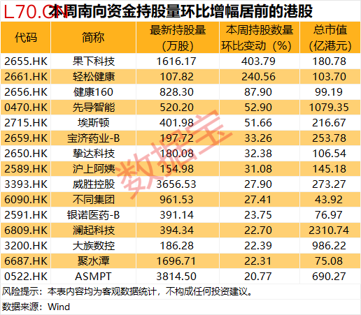 从持股量变化来看,本周15股获得南向资金持股量环比增长超20%,果下科技居首,环比增长403.79%,其他还有轻松健康、健康160、先导智能持股量环比增幅居前,持股量环比增幅分别为240.56%、87.9%、52.9%。