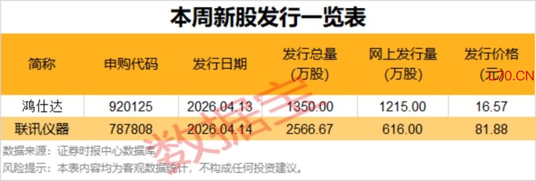 根据发行安排,本周暂有2只新股申购,今日可申购鸿仕达,本周二可申购联讯仪器。