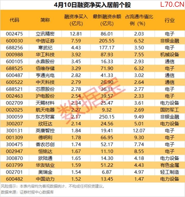 具体到个股,4月10日共有1525只股获融资净买入,净买入金额在1亿元以上的有41只,其中6只融资净买入额超3亿元。立讯精密融资净买入额居首,当日净买入12.81亿元,其次是中信证券、寒武纪,融资净买入金额分别为7.59亿元、4.43亿元,融资净买入金额居前的还有华工科技、永鼎股份、佰维存储等。