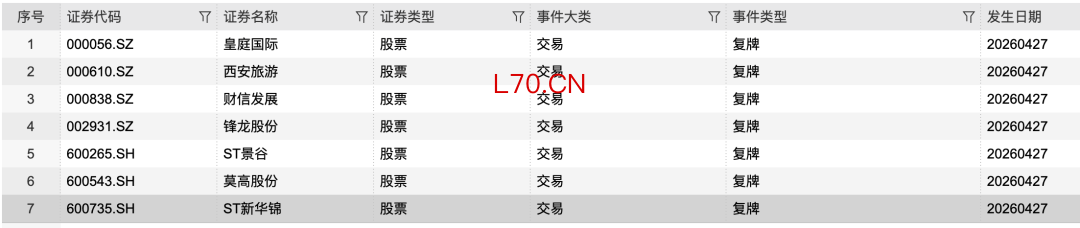 Wind统计数据显示,截至发稿,明日(4月27日)将有7只A股复牌,分别是皇庭国际(000056)、西安旅游(000610)、财信发展(000838)、锋龙股份(002931)、ST景谷(600265)、莫高股份(维权)(600543)、ST新华锦(维权)(600735)。
