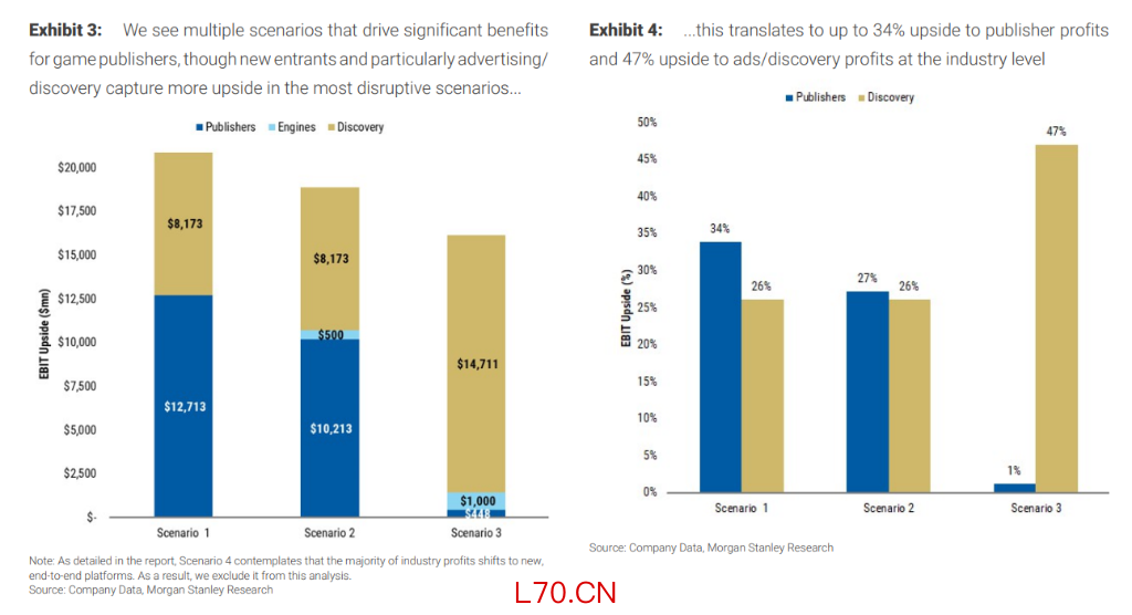 而在更具颠覆性的情景三中,发行商利润几乎被竞争消耗殆尽,广告生态反而独享约147亿美元增量(EBIT提升47%)——核心逻辑在于:当游戏内容泛滥,争夺用户注意力的成本必然飙升。