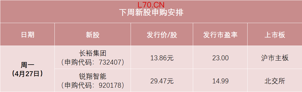 日程安排上,两只新股均在周一(4月27日)申购,分别是沪市主板新股长裕集团、北交所新股锐翔智能。
